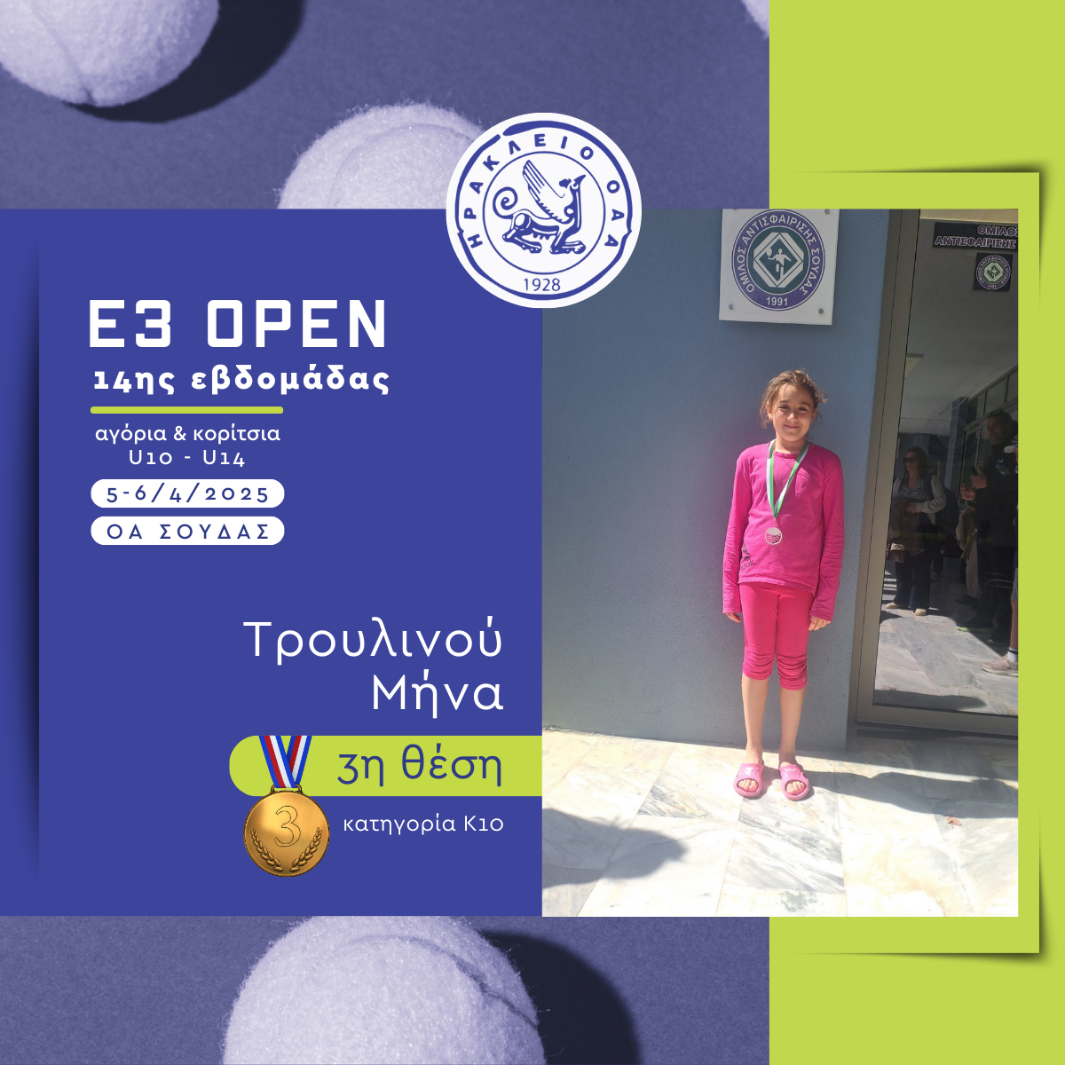 Η Μήνα Τρουλινού στα προκριματικά έκανε μια νίκη και μια ήττα. Κέρδισε την Παναγιωτακοπουλου (ΠΟ Ηρακλείου) 62, ενώ έχασε από την Βλαχάκη 26. Κατάφερε να προκριθεί στο κυρίως ταμπλό, όπου αγωνίστηκε δυναμικά και κατέκτησε την τρίτη θέση.