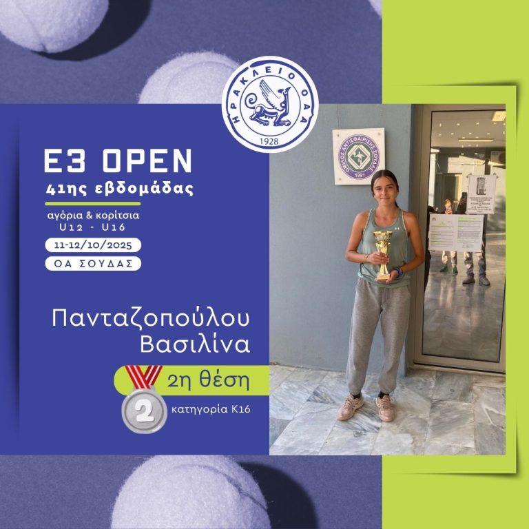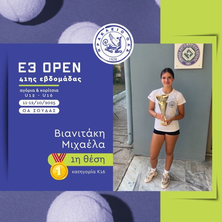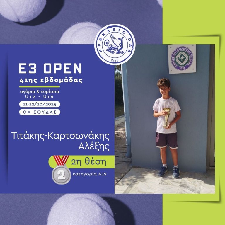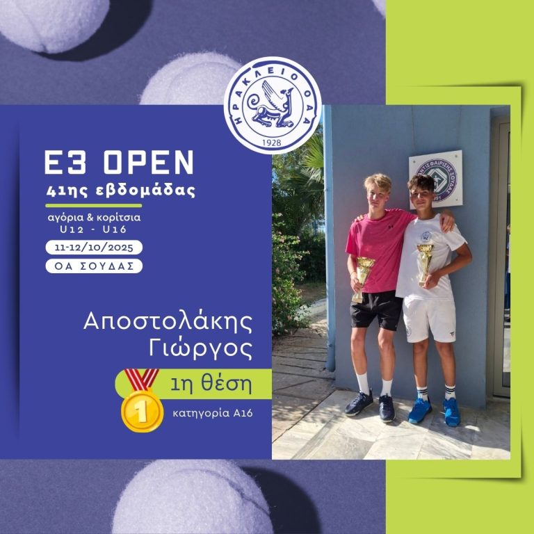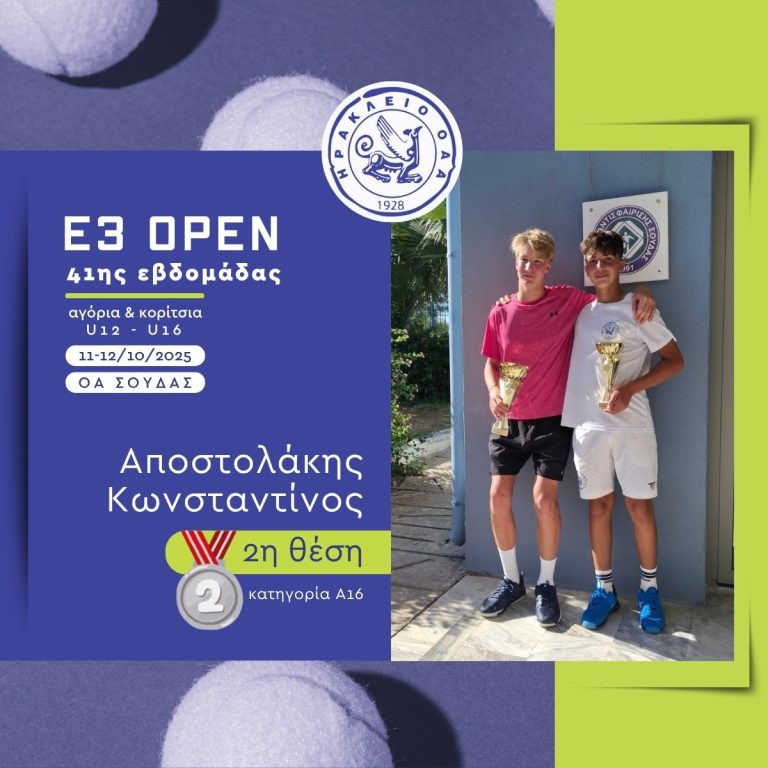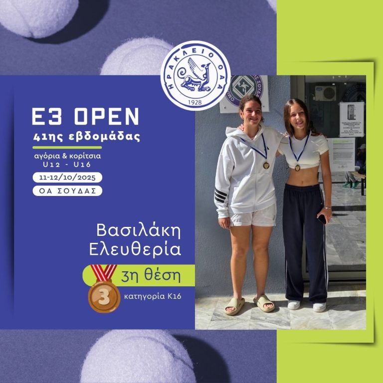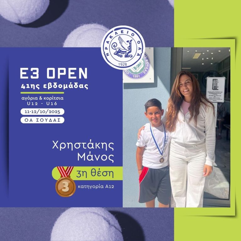 Με εξαιρετική παρουσία ολοκληρώθηκε η συμμετοχή των αθλητών και αθλητριών του «ΗΡΑΚΛΕΙΟ» Ο.Α.Α. στο πρόσφατο Παγκρήτιο Τουρνούα Ε3 που έγινε στην Σούδα και στην Αργυρούπολη. Στο τουρνουά συμμετείχαν συνολικά 18 αθλητές και αθλήτριες του ομίλου, σε πέντε κατηγορίες: Αγόρια 10, 12 και 16 ετών και Κορίτσια 12 και 16 ετών.