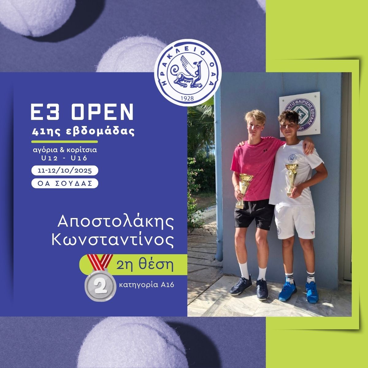 Ο Κωνσταντίνος Αποστολάκης πραγματοποίησε εξαιρετική μια πολύ καλή εμφάνιση στην κατηγορία αγόρια 16 ετών, κατακτώντας τη 2η θέση. Στους προημιτελικούς κέρδισε τον Γιώργο Τσαπάκη με 64, 1-0 πριν ο αντίπαλός του αποχωρήσει. Στα ημιτελικά επικράτησε του Γιώργου Τρούλη ύστερα από ένα συναρπαστικό ματς με 64 26 64, εξασφαλίζοντας την πρόκρισή του στον τελικό. Εκεί αντιμετώπισε τον Γιώργο Αποστολάκη, από τον οποίο ηττήθηκε με 75 40 med.