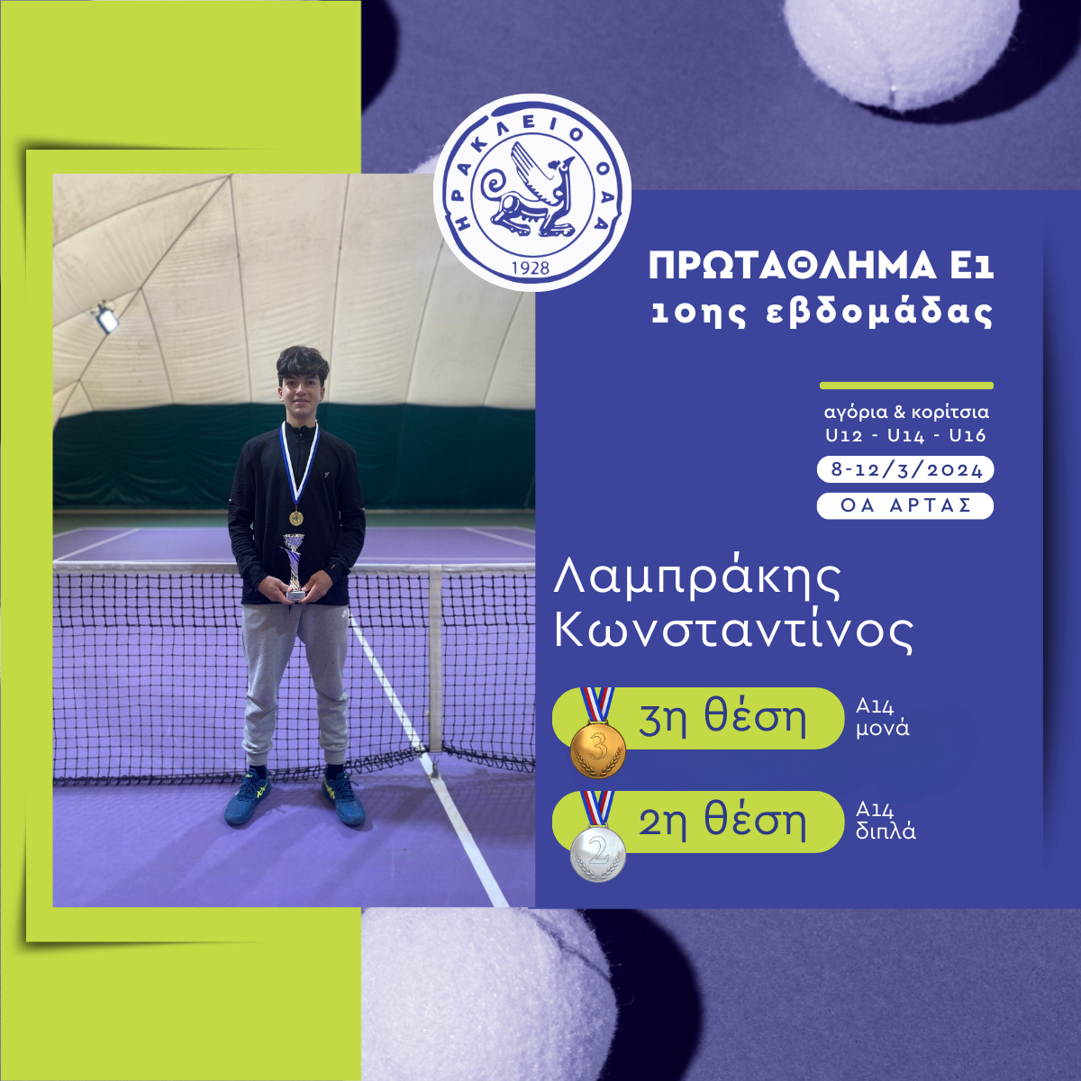 Ο Κωνσταντίνος Λαμπράκης πήρε την δεύτερη θέση σε διπλά και την τρίτη θέση στο μονό. Με συμπαίκτη τον Χατζηνικολάου, σημείωσαν δυο νίκες και έφτασαν στον τελικό, όπου αντιμετώπισαν τους Αυγέρη/ Λυκουρέση, από τους οποίους ηττήθηκαν 46 63 10-3 και πήραν την δεύτερη θέση. Στον ημιτελικό του μονού, αγωνίστηκε με το Νο1 του ταμπλό, τον Αυγέρη (Μενεμένη) και ηττήθηκε 62 60. Ο Λαμπράκης είχε καταφέρει να κερδίσει 62 62 τον Τσίρκα (ΟΑ Άρτας) και στους 16 τον Βασιλόπουλο (ΑΟΑ Πατρών) 64 62. Στους οκτώ κέρδισε τον Καλπαξίδη (Πάνθηρες) 63 46 64 και πέρασε στα ημιτελικά.