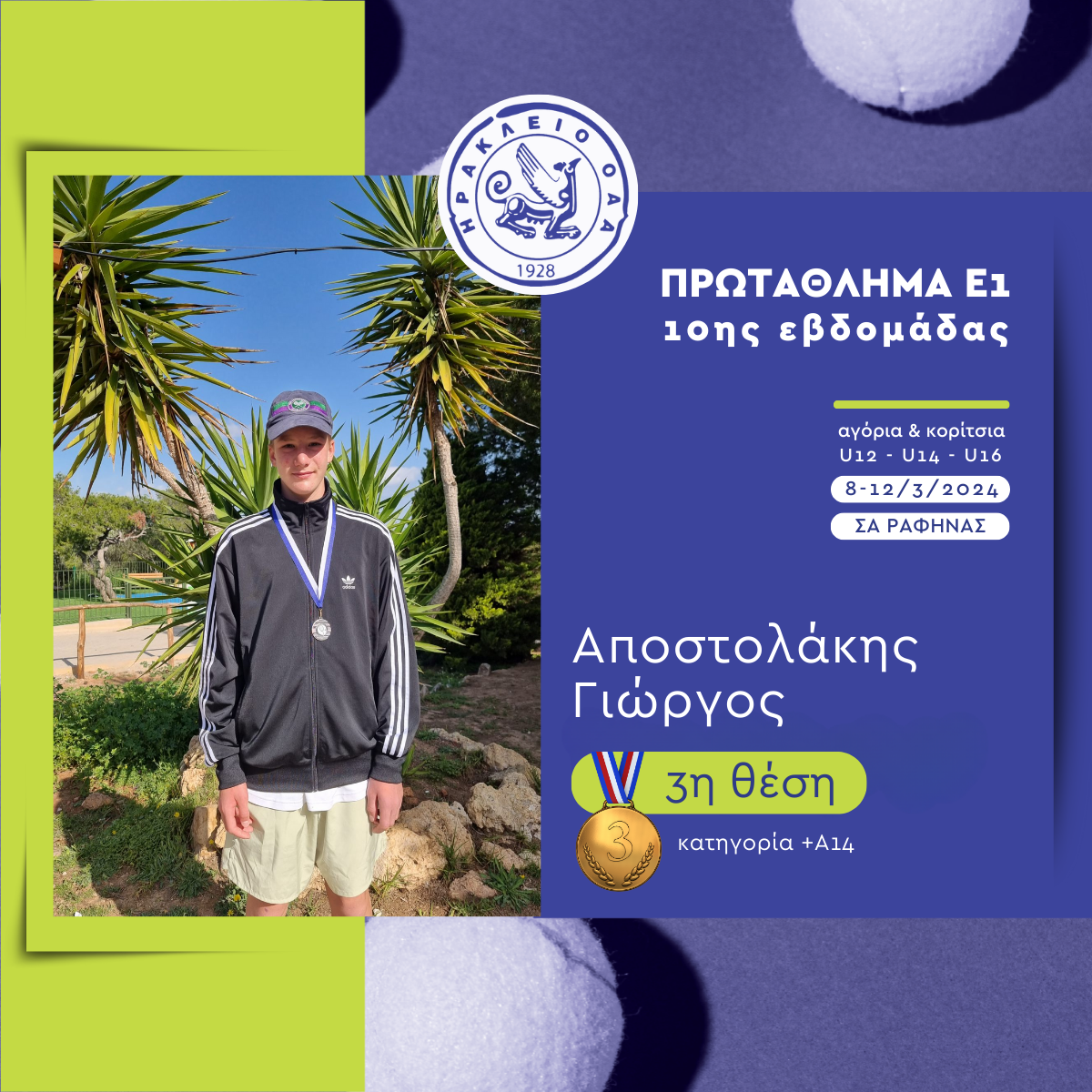 Ο Γιώργος Αποστολάκης, κατέκτησε την τρίτη θέση στα μονά στην κατηγορία των 14 ετών. Στον ημιτελικό, αγωνίστηκε με το Νο2 του ταμπλό, τον Μοτσάκο (Περιστέρι) από τον οποίο ηττήθηκε 61 62. Νωρίτερα ο Αποστολάκης, κέρδισε στον πρώτο γύρο τον Γρηγορίου (ΑΟΑ Πεύκης) 64 62. Στους 16 κέρδισε τον Γεωργακάκο (Κόρινθο) 60 62 και μπήκε στην οκτάδα, όπου επικράτησε με 61 57 64 του Ιωαννάτου (ΑΟ Π. Φαλήρου) και πέρασε στα ημιτελικά.